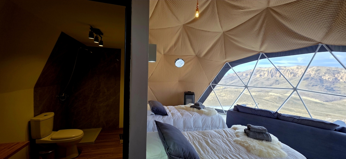 We have a glamping of 3 domes and lodges at 1,250 m.a.s.l. with different proportions and capacity to accommodate a total of 12 people; living and dining room; rooms with private bathroom; heating; hot water,showers; double and single comfortable beds and dry sauna . It offers a beautiful and remote environment, spectacular views of the valleys and rivers. The Glamping is warm and comfortable, with cool atmosphere.